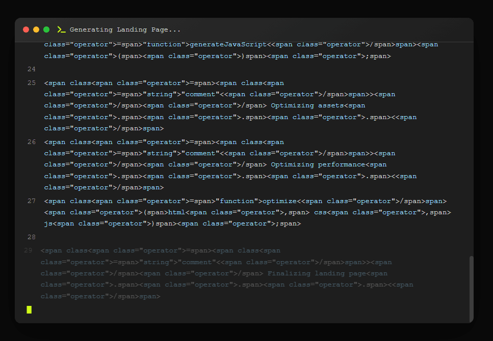 “hãy thêm chức năng mới cho phần load “Đang tạo landing page… Vui lòng chờ trong giây lát” hiện tại trở thành giao diện các dòng code đang chạy trực tiếp nhằm giảm thiểu sự buồn chán khi thời gian chờ lâu”