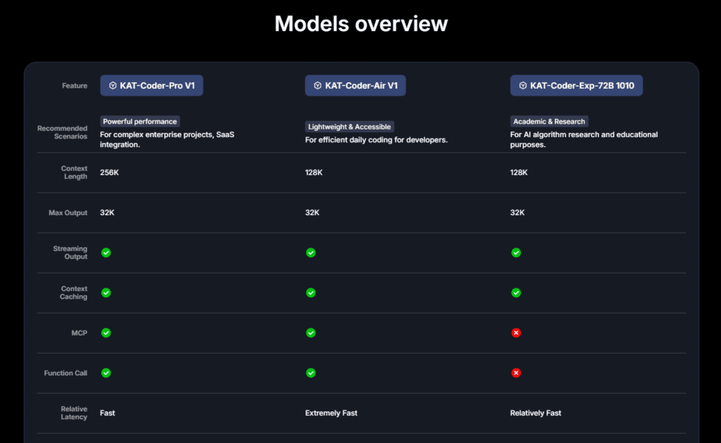 • KAT Coder (flagship) –  bản đóng đi kèm API (StreamLake, Novita AI), dành cho đội ngũ sản xuất.