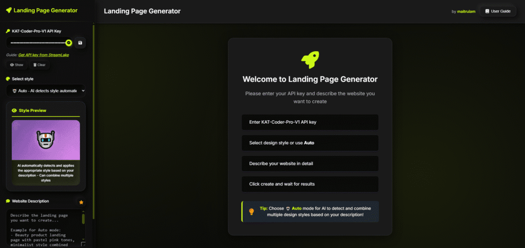 – Thanh bên sẽ cho phép người dùng thêm api key vào, ô viết prompt mô tả website, drop down chọn phong cách