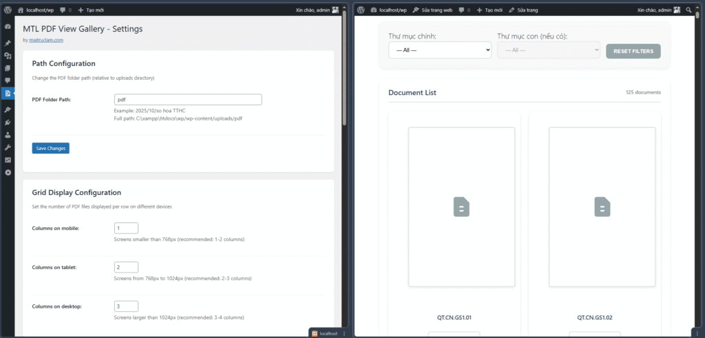 Ngoài cái trên ra thì tôi còn tạo 1 plugin WordPress với chức năng khi cần trưng bày một loạt tài liệu PDF đã phân loại từ trên máy tính dựa theo thư mục mà không cần phải tải lên từng file, đặt tag, đặt category, đổi lại tên,… Thì tôi có 1 giải pháp đó là MTL PDF View Gallery – 1 plugin hoàn toàn miễn phí và dễ sử dụng.